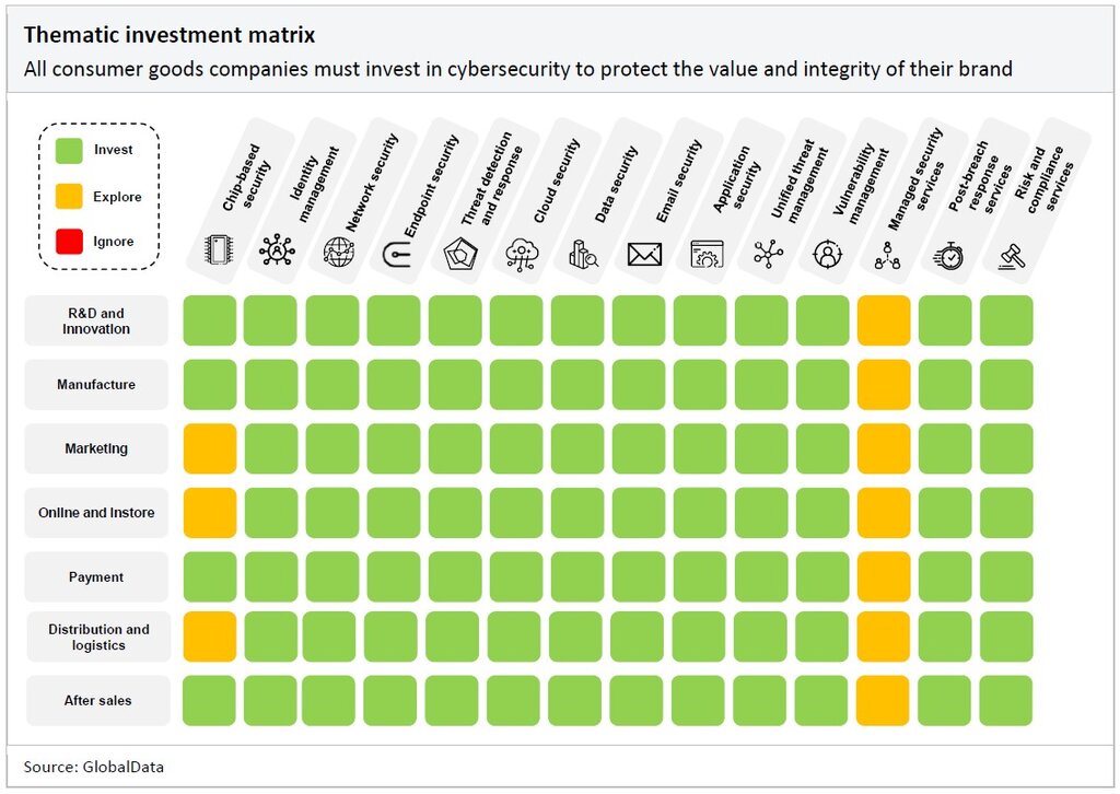 The matrix below details the areas of cybersecurity in which consumer goods companies should focus their time and resources. We suggest consumer goods companies should invest in technologies shaded green, explore the prospect of investing in technologies shaded yellow, and ignore technologies shaded red.