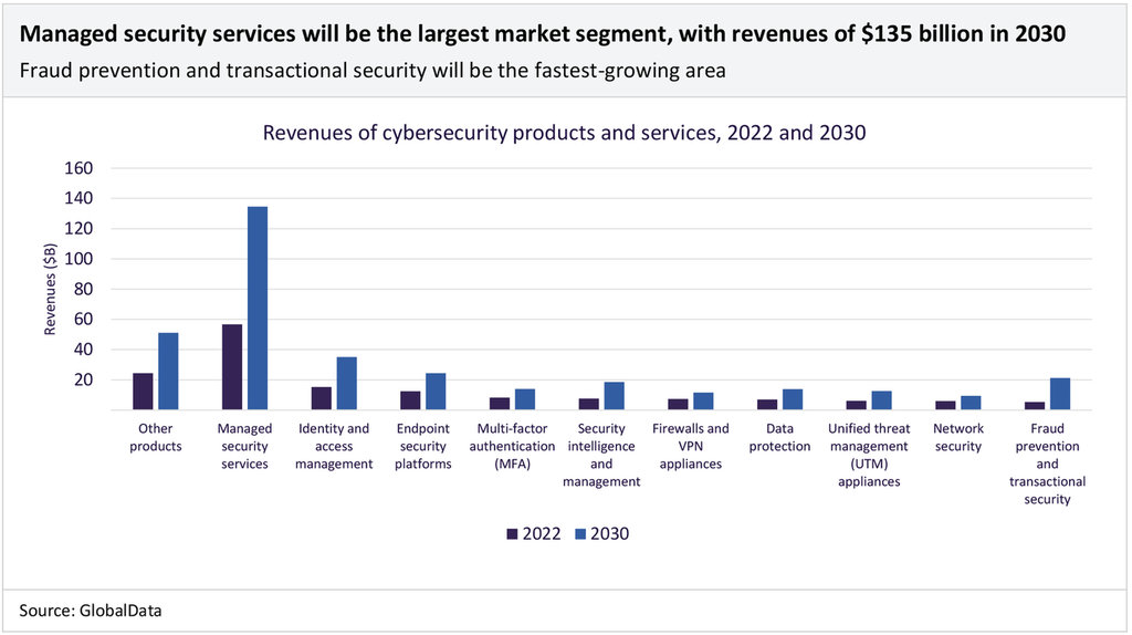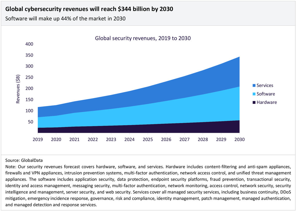 According to GlobalData forecasts, the global cybersecurity market will be worth $334bn by 2030, having grown at a compound annual growth rate (CAGR) of 10% between 2022 and 2030. Software-based cybersecurity products will be the largest market segment, contributing 44% of total revenue in 2030, with services accounting for 39%.