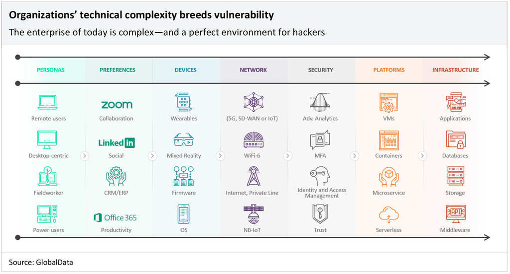 Organisations’ technical complexity breeds vulnerability. Every organisation has an array of devices, networks, platforms, and infrastructure, and this complexity creates vulnerabilities. The move to remote working due to the pandemic added widespread use of collaboration tools to a mix that already included operating systems, identity and access management, multi-factor authentication, virtual machines, containers, applications, databases, storage, and middleware. The enterprise of today is complex, and a perfect environment for hackers.